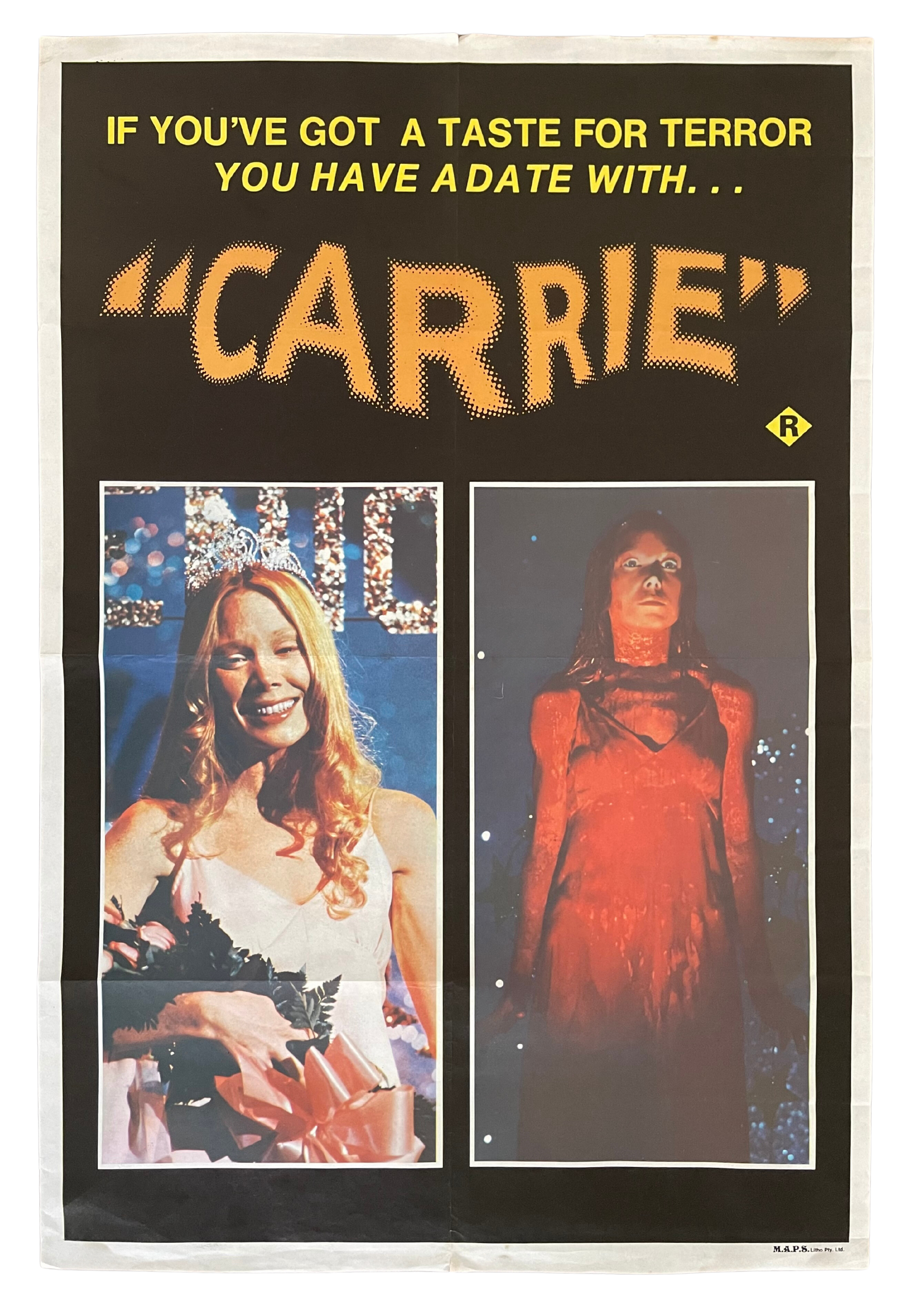 The tagline, "If you have a taste for terror, you have a date with...," sets the tone for a chilling cinematic experience. The blood-red glow, reflecting Carrie's telekinetic powers, dominates the poster, creating an atmosphere of impending doom. Brace yourself for a journey into the psychological depths of high school torment and supernatural terror.