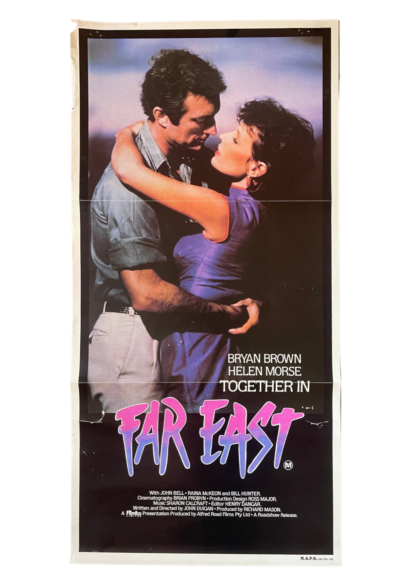 Experience a wartime romance with this original Australian daybill cinema poster for "Far East" (1982). Directed by John Duigan and starring Bryan Brown and Helen Morse, this drama set during World War II follows the relationship between an Australian soldier and a Japanese woman. The poster features evocative artwork that captures the film's emotional depth and the backdrop of war. Measuring 13 x 30 inches, this daybill cinema poster is in decent condition, ready to add a touch of poignant storytelling to your collection.