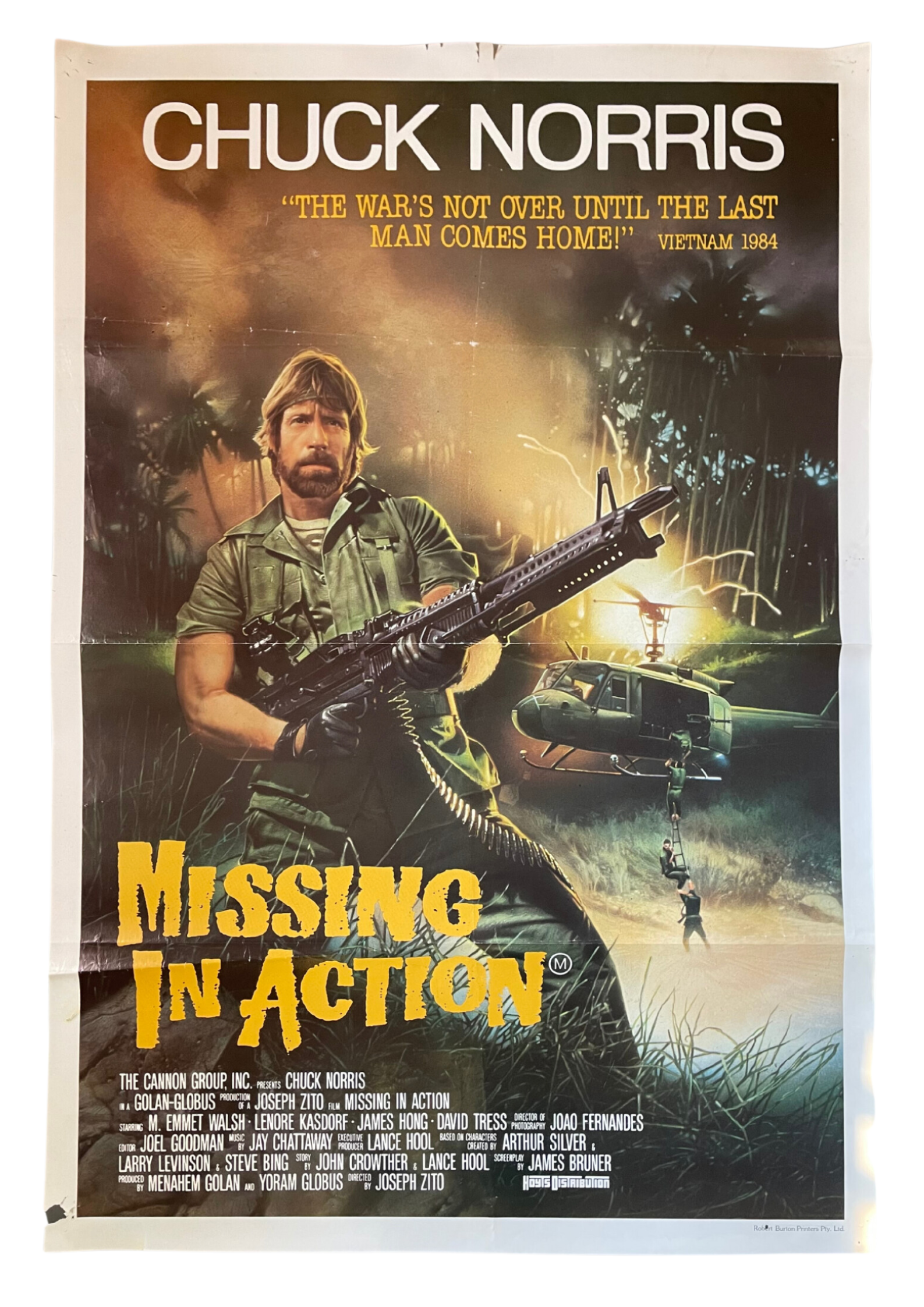 Immerse yourself in an action-packed journey through the rugged landscapes of Vietnam with the original Australian one sheet cinema poster of "Missing in Action." Directed by the legendary Joseph Zito, this explosive war film stars the iconic Chuck Norris as Colonel James Braddock, a relentless warrior on a mission to rescue American POWs left behind after the Vietnam War. The captivating poster showcases Norris in his prime, armed with determination and a blazing machine gun, as he fights against all odds to bring his brothers-in-arms back home. Don't miss this adrenaline-fueled cinematic experience that will keep you on the edge of your seat!
