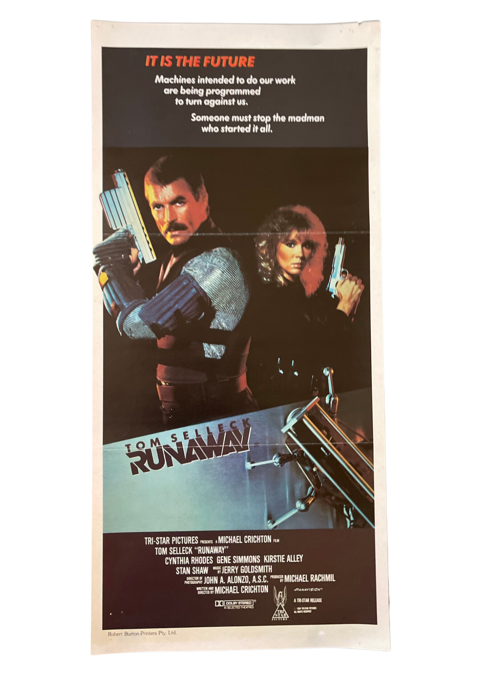 Brace yourself for a thrilling sci-fi escapade with this original Australian daybill cinema poster for "Runaway." Released in 1984, this electrifying film is directed by Michael Crichton and stars Tom Selleck, Cynthia Rhodes, and Gene Simmons. The poster showcases a dynamic design that captures the intensity and futuristic setting of the film. Measuring 13 x 30 inches, this daybill cinema poster is ready to add a touch of excitement to your collection. Perfect for fans of action-packed sci-fi adventures, it's a standout piece of movie memorabilia.