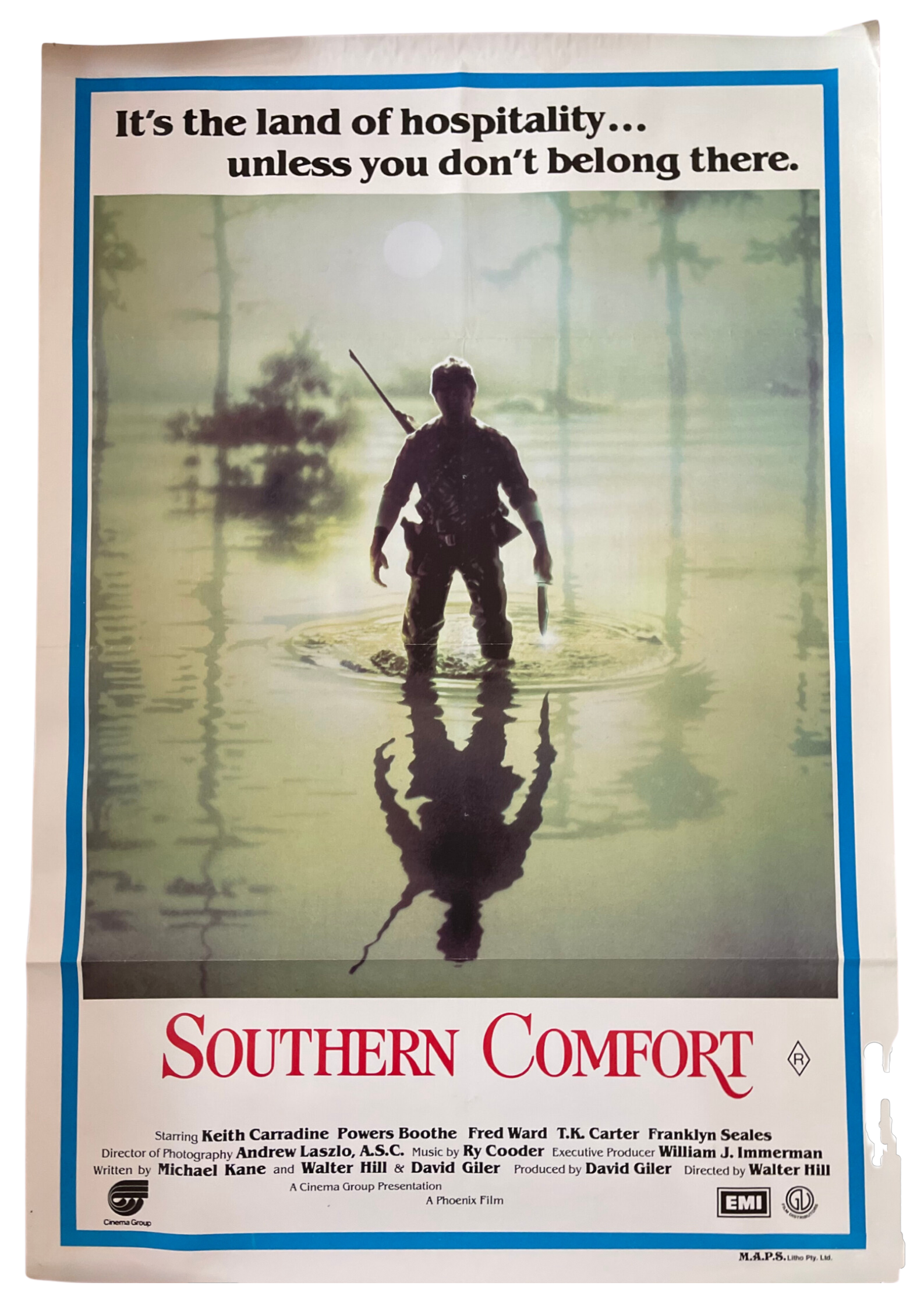 mmerse yourself in the chilling and suspenseful world of the Louisiana bayou with this captivating one-sheet cinema poster for "Southern Comfort" (1981). Directed by Walter Hill and starring Keith Carradine and Powers Boothe, this action-thriller takes you on a harrowing journey as a group of National Guardsmen faces unexpected peril while navigating the treacherous swamps and hostile Cajun territory. The poster's gripping and atmospheric design captures the tension and danger that unfolds as these soldiers find themselves fighting for their lives against a force they never saw coming. Measuring approximately 27 x 41 inches, this one-sheet cinema poster is a prized addition to your collection, celebrating the raw intensity and primal instincts depicted in this underrated classic. Transport yourself to the eerie and unforgiving landscapes of "Southern Comfort," where survival takes on a whole new meaning, and the line between friend and foe blurs in the face of danger. Hang this iconic poster on your wall and let the haunting atmosphere of "Southern Comfort" keep you on the edge of your seat.