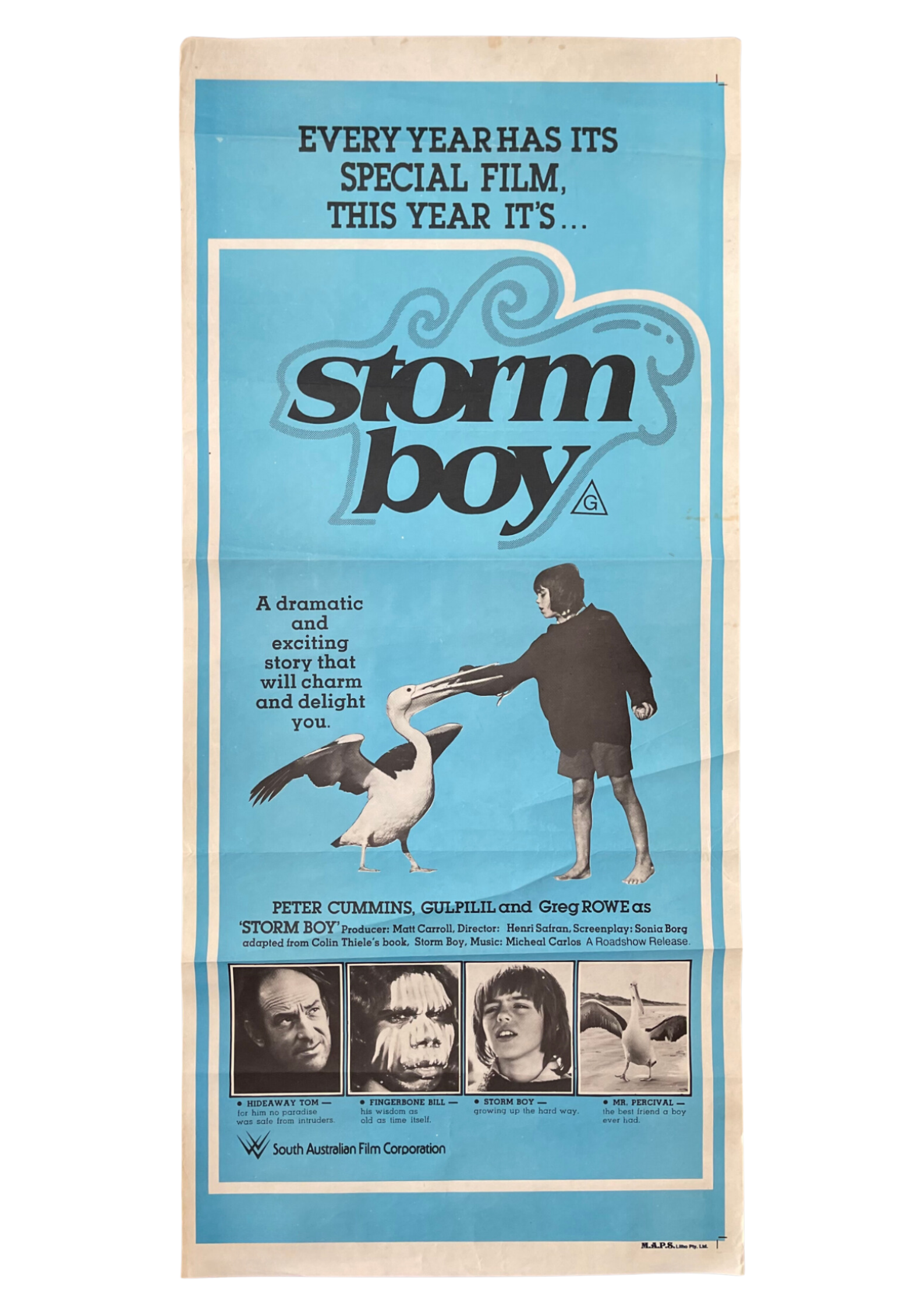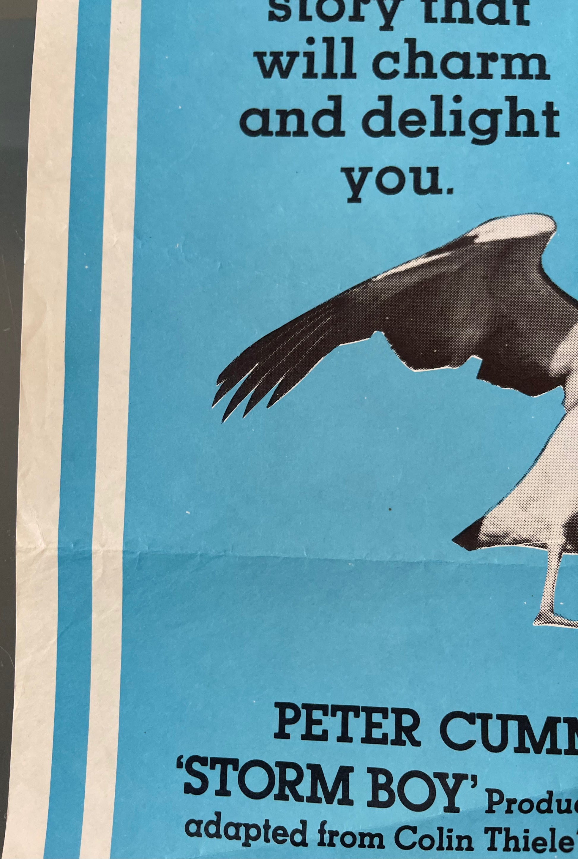 Experience a heartwarming and touching tale of friendship and nature's beauty with this original Australian daybill cinema poster for "Storm Boy" (1976). Directed by Henri Safran and based on Colin Thiele's novel, this family-friendly drama follows the bond between a young boy named Mike and a pelican he rescues and names Mr. Percival. The poster's charming and evocative design captures the beauty of the Australian coastline and the endearing connection between the boy and the majestic pelican, promising a cinematic experience that will warm your heart. Measuring 13 x 30 inches, this daybill cinema poster is a cherished addition to your collection, celebrating the enduring legacy of this beloved Australian classic. Join Mike and Mr. Percival on their touching adventure, where friendship knows no bounds and the beauty of nature comes to life. Hang "Storm Boy" on your wall and let the magic of this heartwarming film remind you of the timeless wonder and joy of childhood friendships.
