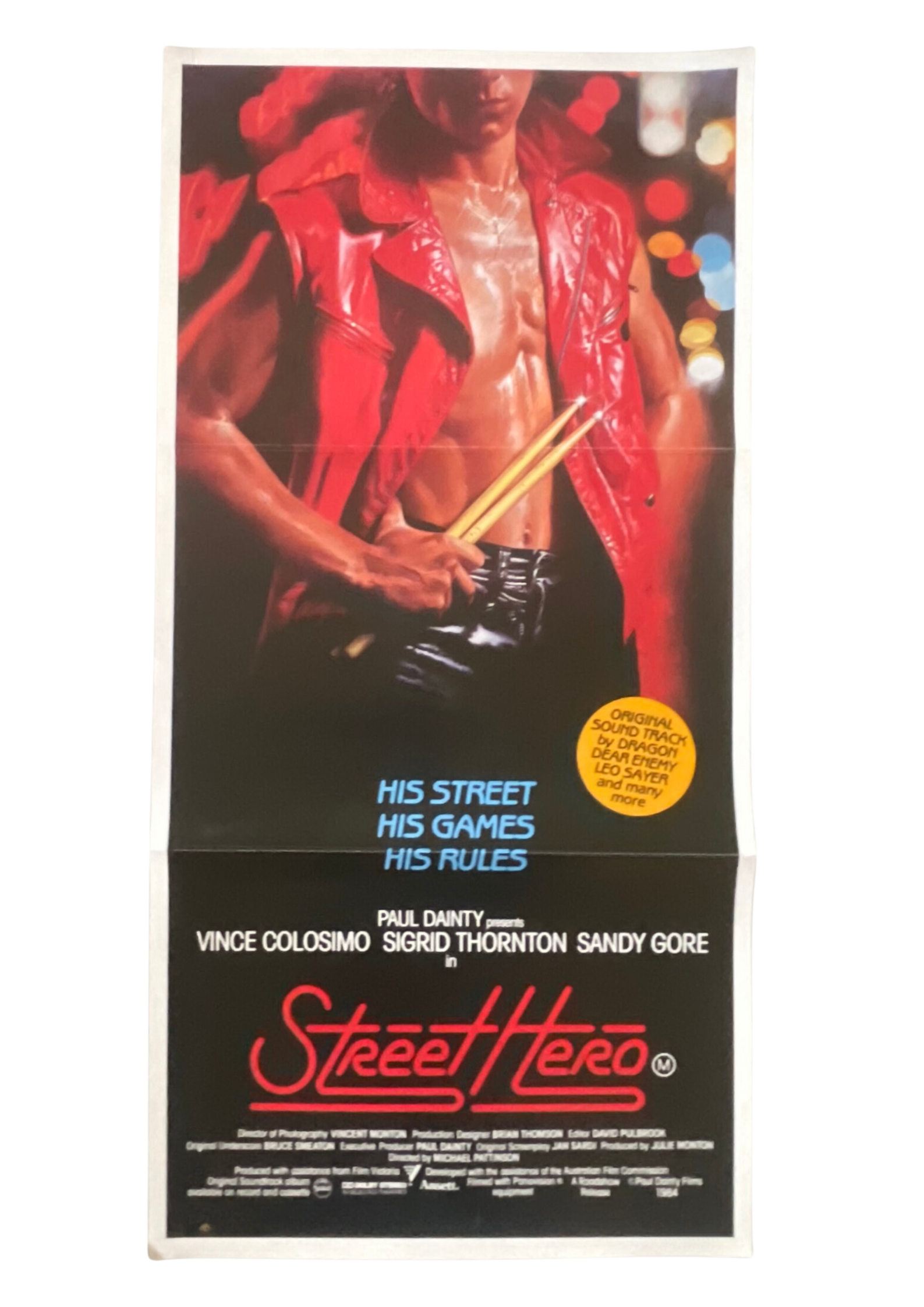 Immerse yourself in the gritty and exhilarating world of street racing with this original Australian daybill cinema poster for "Street Hero" (1984). Directed by Michael Pattinson and starring Vince Colosimo, this Australian drama follows the life of an aspiring young musician who finds himself drawn into the dangerous world of illegal street racing to support his family. The poster's vibrant and dynamic design captures the adrenaline-fueled atmosphere of the street racing scene, promising a cinematic experience filled with raw energy and heart-pounding action. Measuring 13 x 30 inches, this daybill cinema poster is a prized addition to your collection, celebrating the rebellious spirit and determination of the film's protagonist. Join the exhilarating race through the streets of urban Australia and witness the passion and drive that defines the journey of a street hero. Hang "Street Hero" on your wall and let the rush of excitement and the beat of the city streets transport you to a world of dreams and aspirations.
