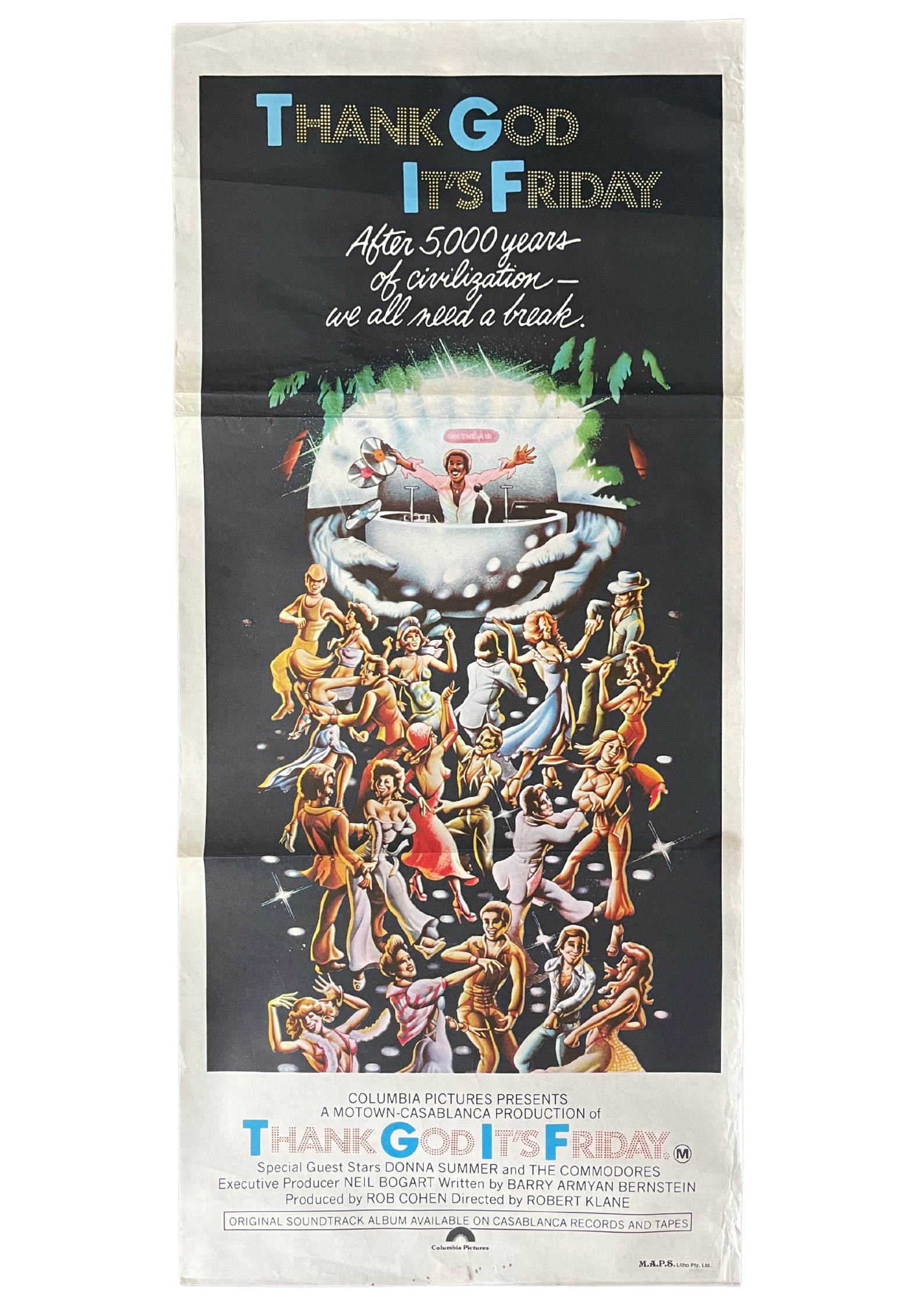 Get ready to groove to the disco beat with this original Australian daybill cinema poster for "Thank God It's Friday" (1978). Directed by Robert Klane, this musical comedy captures the spirit of a Friday night at a Los Angeles disco club. The poster's vibrant design reflects the glitz and glamour of the disco era, promising a cinematic experience filled with music, dancing, and fun. Measuring 13 x 30 inches, this daybill cinema poster is a nostalgic treasure for disco enthusiasts, commemorating the film's celebration of the disco culture and carefree spirit. Hang "Thank God It's Friday" on your wall and let its infectious energy and retro charm transport you to the dance floors of the 1970s.