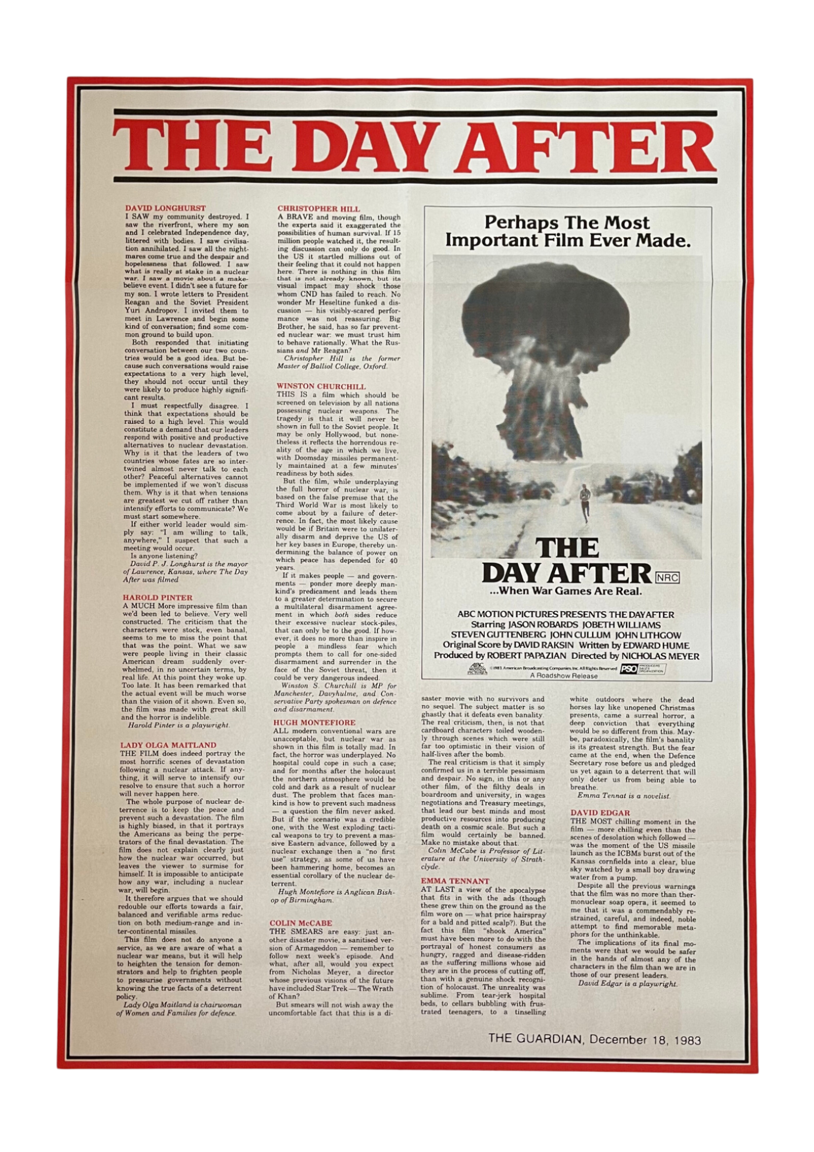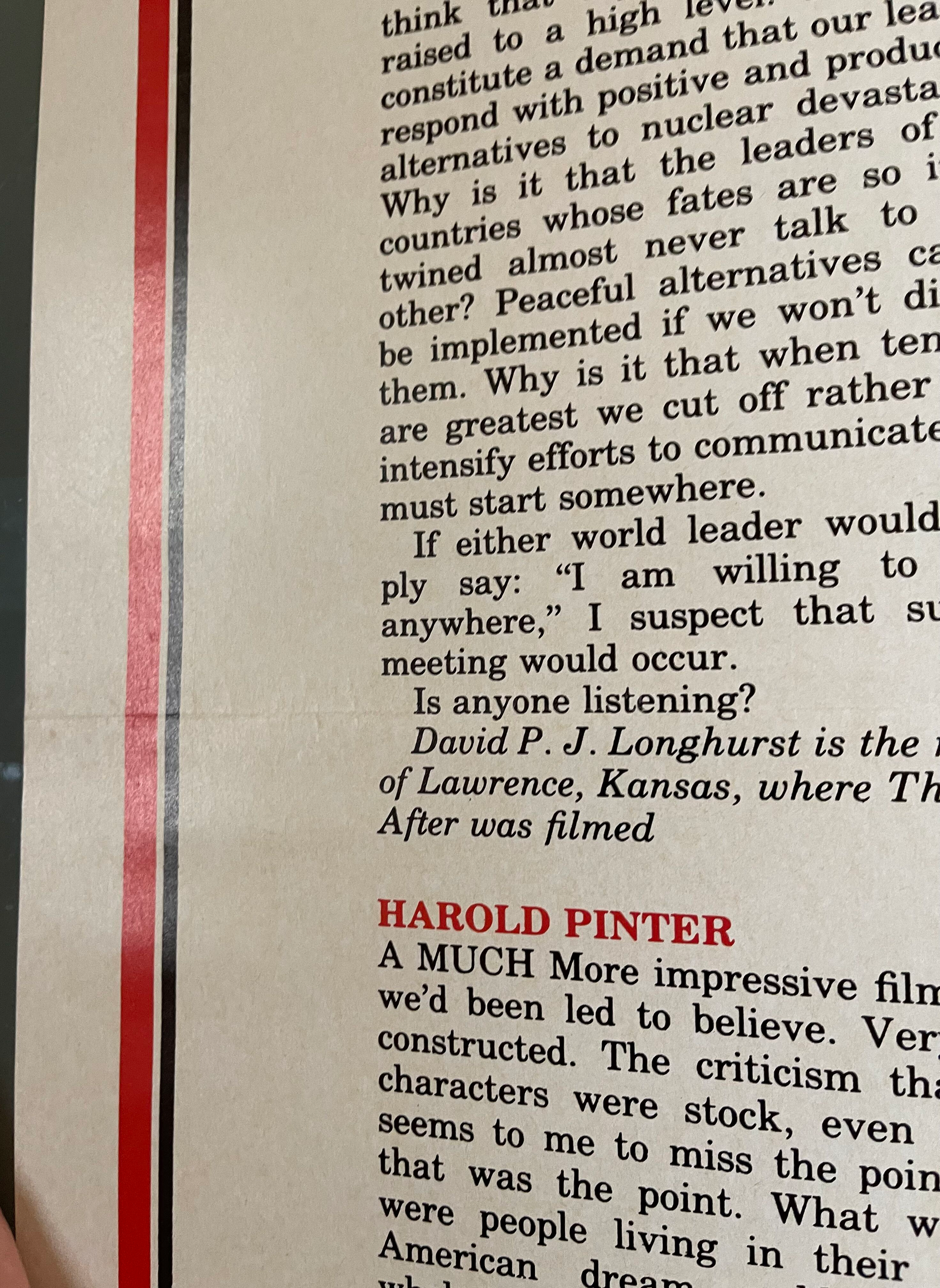 Brace yourself for a powerful and thought-provoking experience with this original Australian one sheet cinema poster for "The Day After" (1983). Directed by Nicholas Meyer, this TV movie depicts the devastating aftermath of a nuclear war on the small town of Lawrence, Kansas. The poster features impactful artwork that captures the solemn and haunting tone of the film. Measuring 27 x 41 inches, this one sheet cinema poster is in good condition, ready to evoke reflection and raise awareness of the consequences of nuclear conflict.