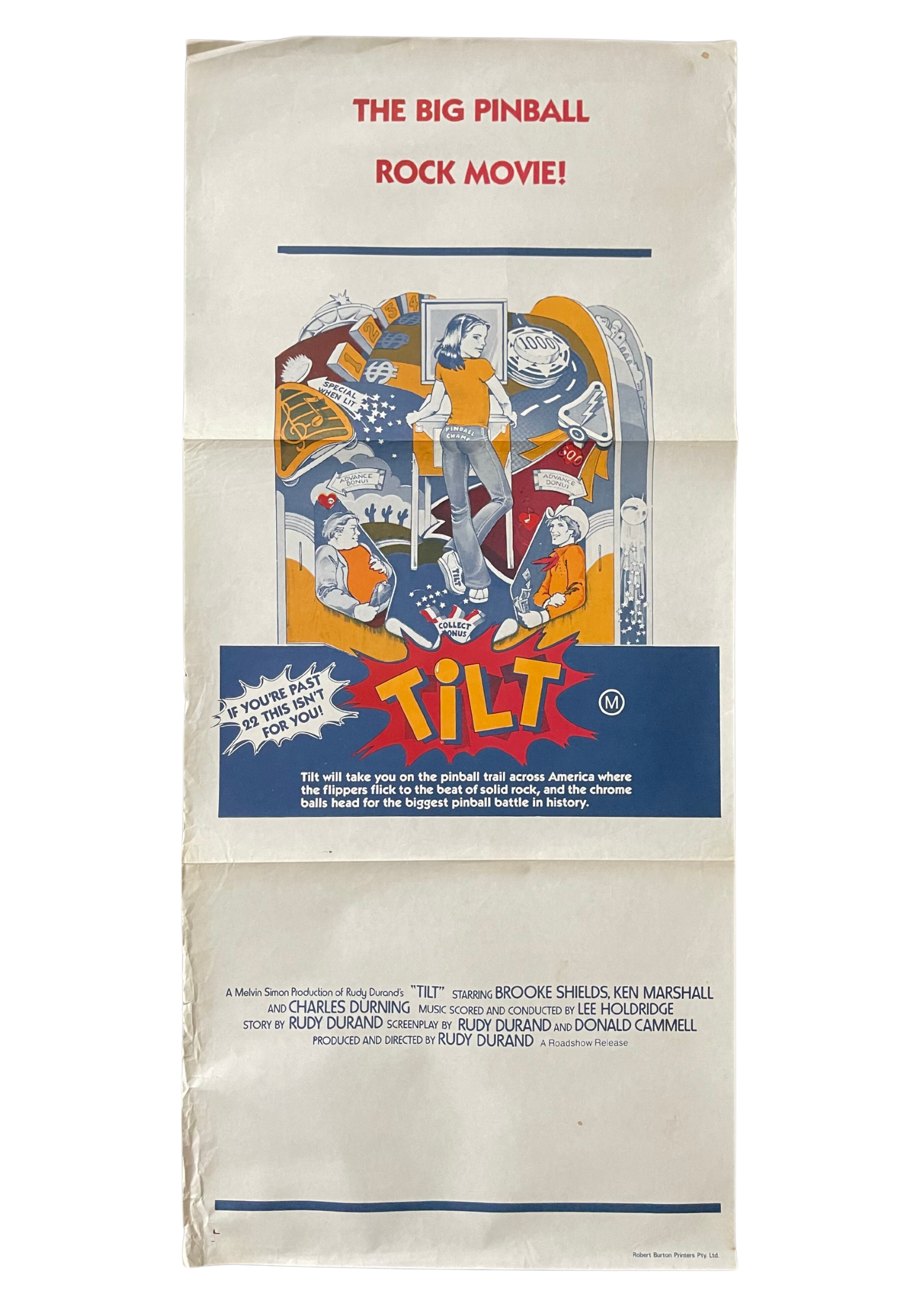Transport yourself back to 1979 with this vintage daybill poster for "Tilt." Directed by Rudy Durand, this classic film explores the world of pinball and the competitive subculture surrounding it. Set in the bustling arcades of America, "Tilt" follows the journey of a young, determined pinball player as he navigates the highs and lows of the game and life. With its retro charm and timeless themes of ambition and determination, "Tilt" promises an entertaining ride for audiences of all ages. This daybill poster captures the nostalgia and excitement of the era, inviting viewers to step back in time and experience the thrill of the silver ball.