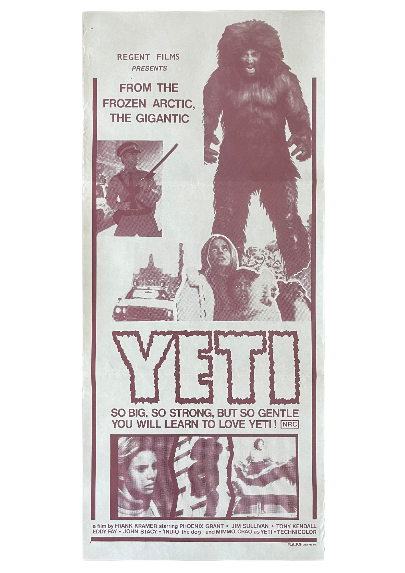 Embark on a thrilling and colossal adventure with this original Australian daybill cinema poster for "Yeti: Giant of the 20th Century" (1977). Directed by Gianfranco Parolini, this science fiction monster film follows the awe-inspiring discovery of a giant Yeti in the Arctic Circle, brought to civilization for scientific study and spectacle. The poster's captivating and dramatic design captures the awe and terror of encountering the legendary creature, promising a cinematic experience filled with excitement and suspense. Measuring 13 x 30 inches, this daybill cinema poster is a prized addition to your collection, celebrating the spectacle and wonder of "Yeti: Giant of the 20th Century." Join the enthralling journey as the giant Yeti roams the modern world, igniting chaos and amazement wherever it treads. Hang "Yeti: Giant of the 20th Century" on your wall and let the mythical and monstrous presence of the creature remind you of the mysteries and marvels that lie beyond our imagination.
